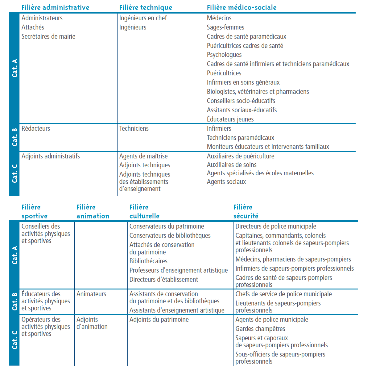 Les grades pouvant être détenus par les fonctionnaires sont structurés selon une hiérarchie propre aux métiers de la fonction publique territoriale.